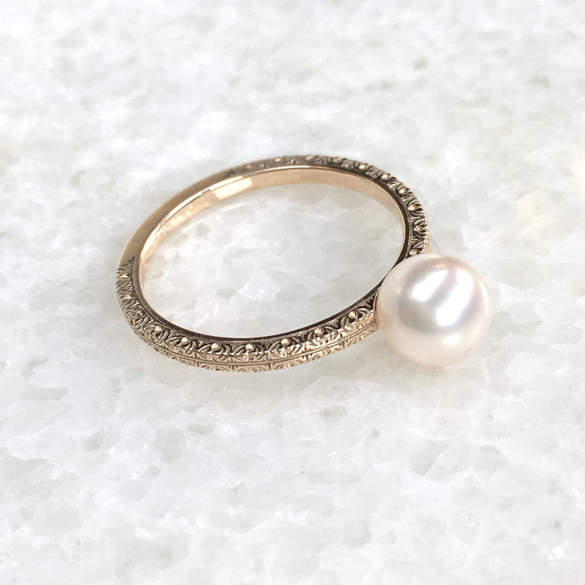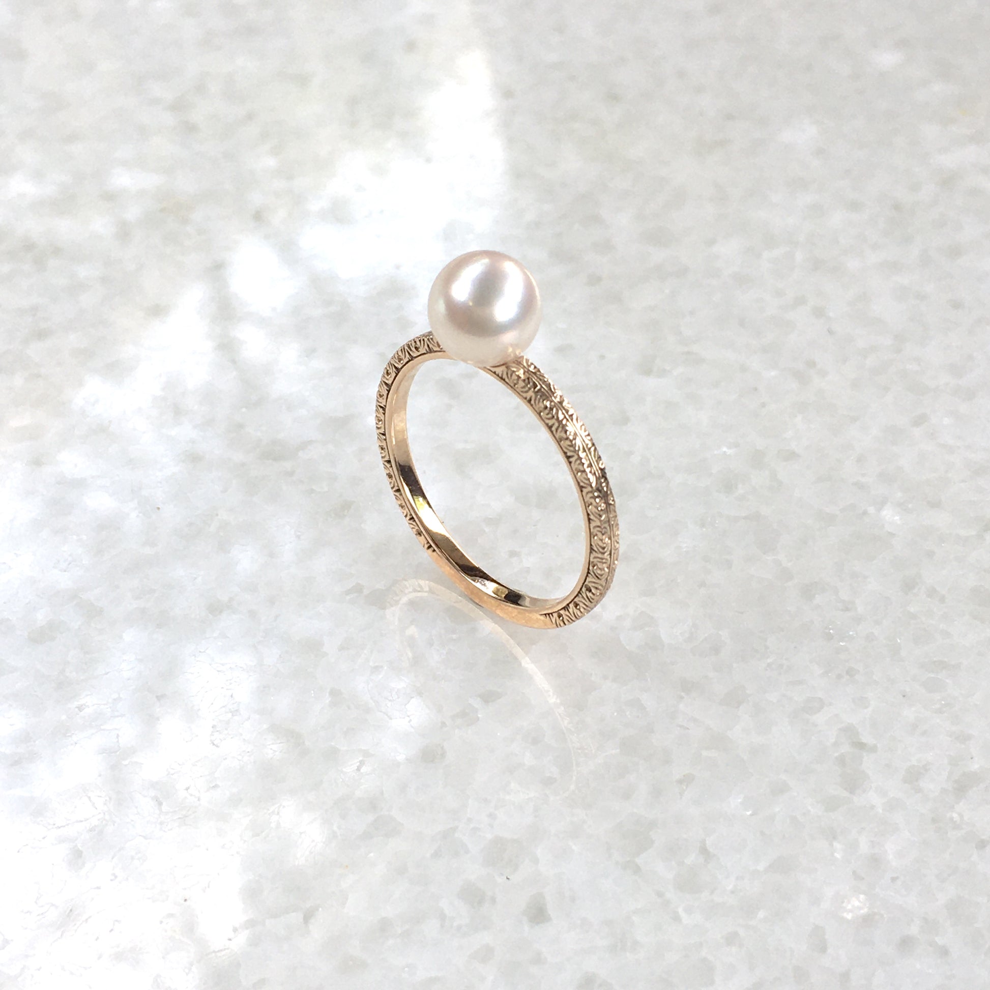 パールが主役でありながら、それを支える細身のリングにも細かな模様を施してあります。