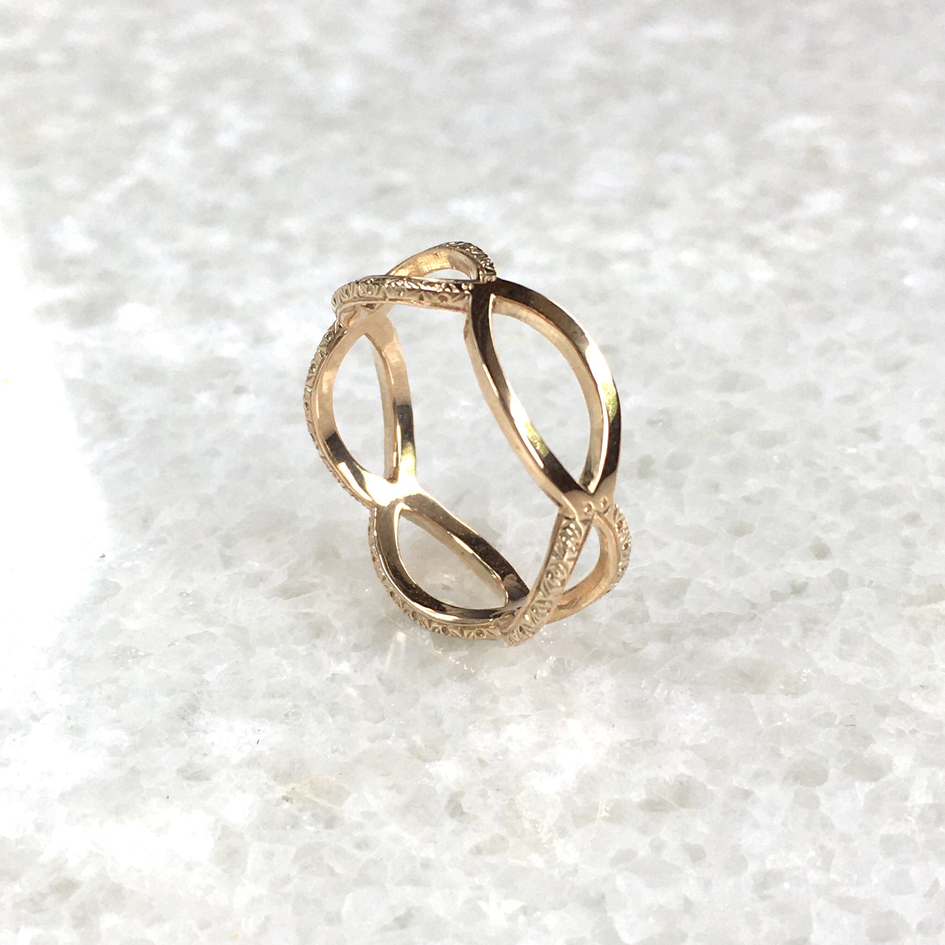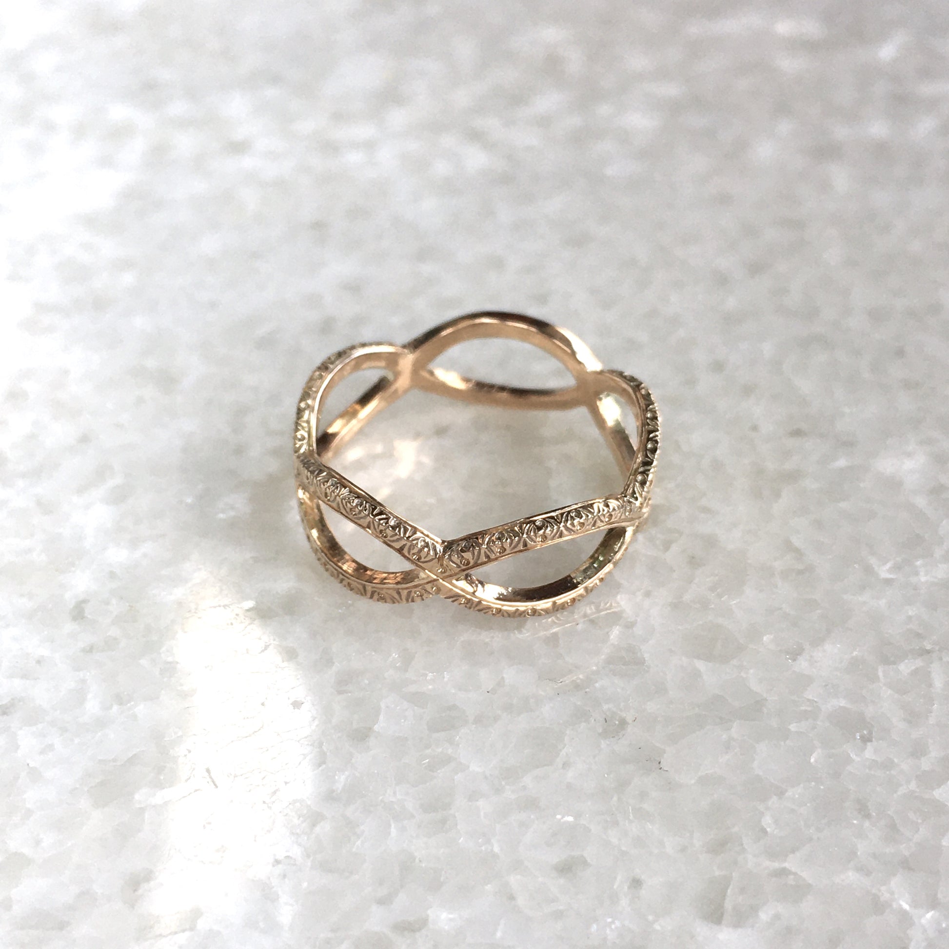 飾り彫りを施された2本のリングが連続して交差する、K10イエローゴールドのリングです。