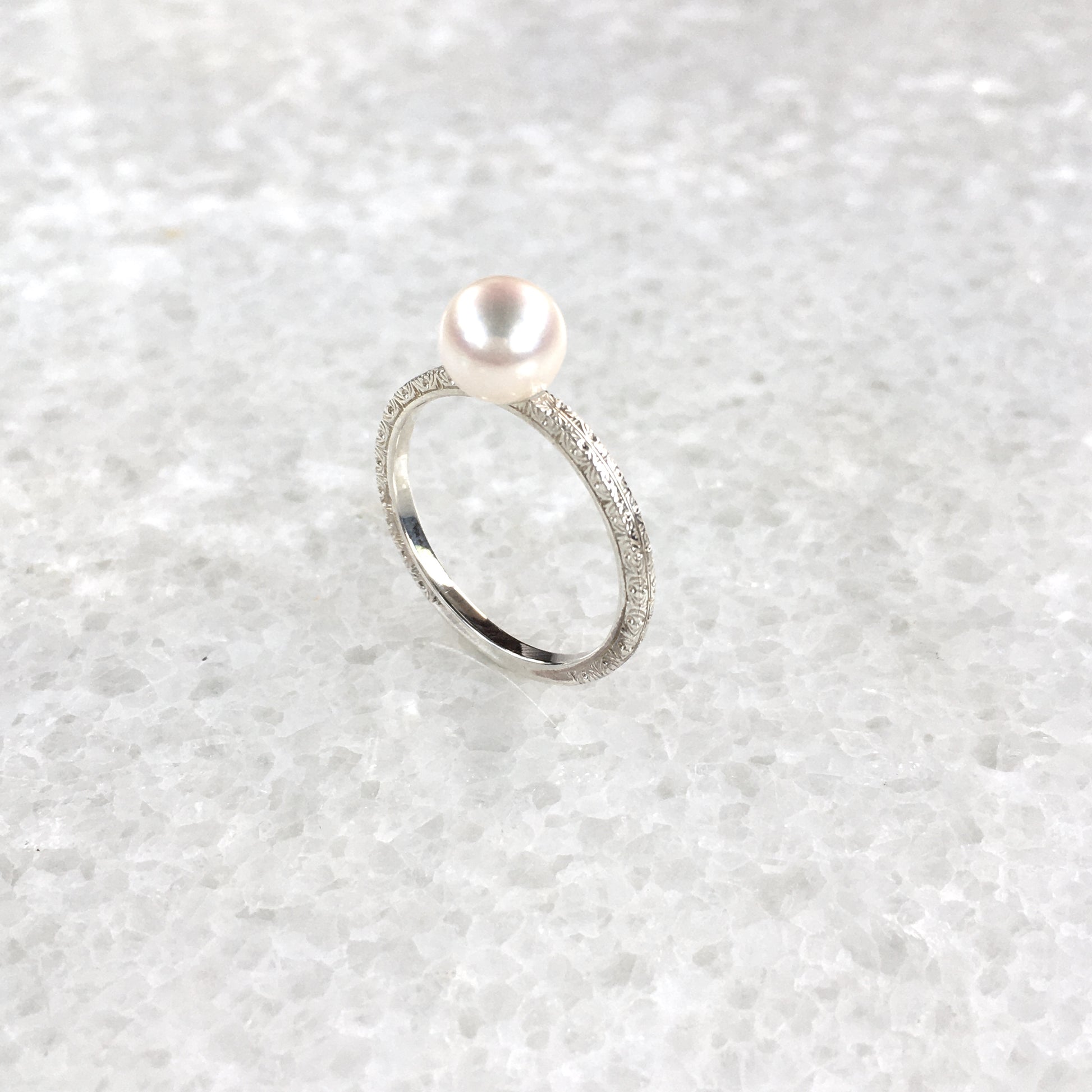 飾り彫りを施された細いリングの上に、1粒のパールが止まっています。