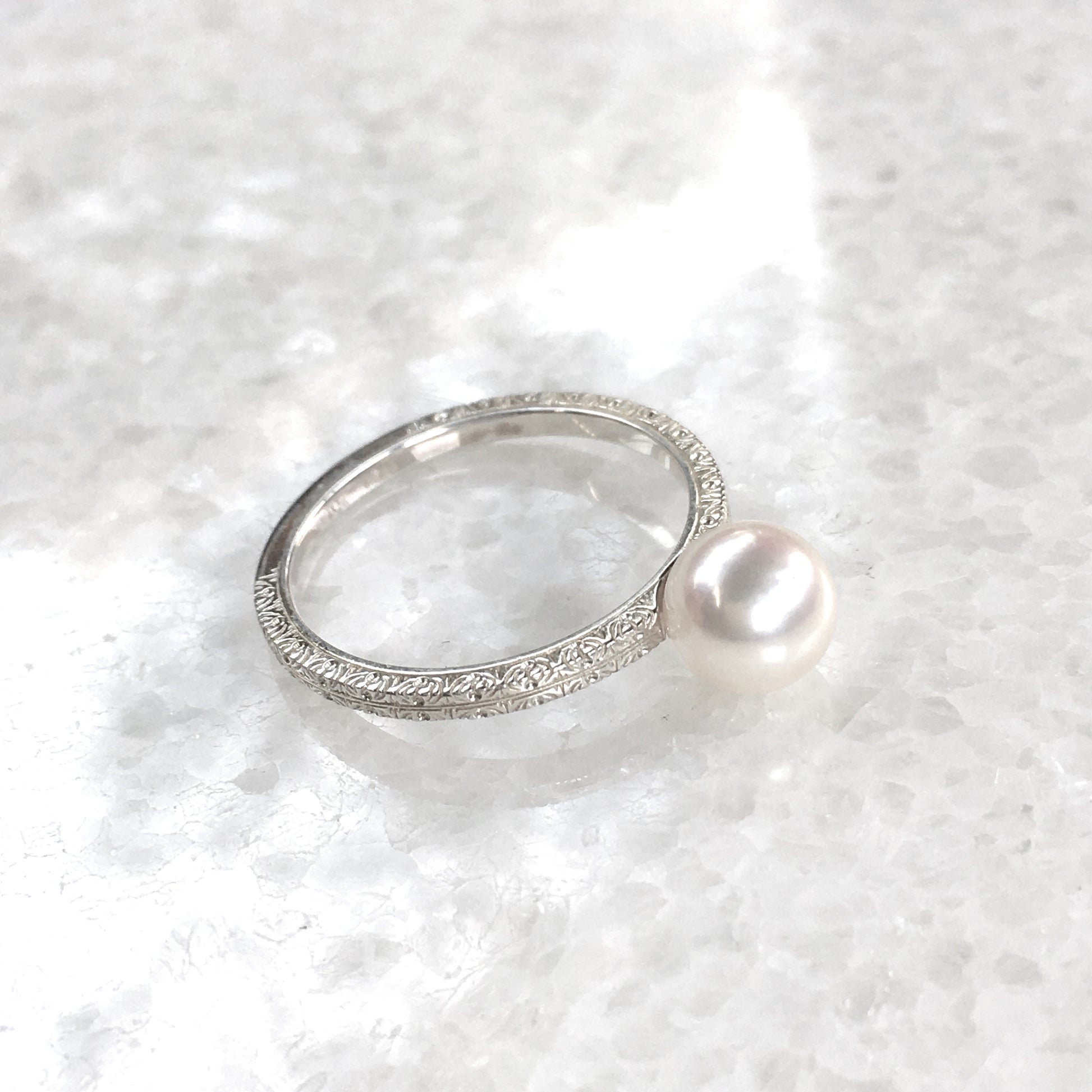 パールが主役でありながら、それを支える細身のリングにも細かな模様を施してあります。
